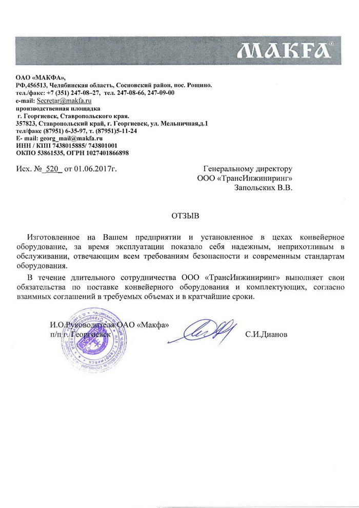 Изготовленное на Вашем предприятии и установленное в цехах конвейерное оборудование, за время эксплуатации показало себя надежными, неприхотливыми в обслуживании, отвечающими всем требованиям безопасности и современным стандартам оборудования.