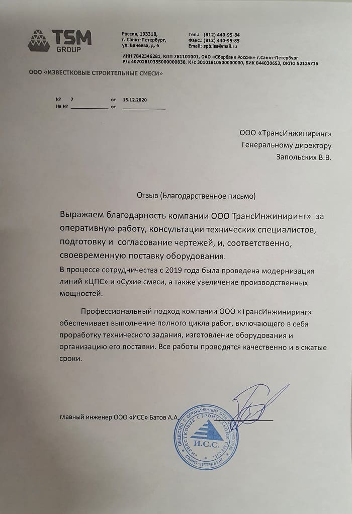 Директор Отзыв от ООО «ИЗВЕСТКОВЫЕ СТРОИТЕЛЬНЫЕ СМЕСИ»14 декабря 2020 Выражаем благодарность компании ООО «ТрансИнжиниринг» за оперативную работу, консультации технических специалистов, подготовку и согласование чертежей, и, соответственно, своевременную поставку оборудования. В процессе сотрудничества с 2019 года была проведена модернизация линии и увеличение производственных мощностей. Профессиональный подход компании ООО «ТрансИнжиниринг» обеспечивает выполнение полного цикла работ, включающего в себя проработку технического задания, изготовление оборудования и организацию его поставки. Все работы проводятся качественно и в сжатые сроки.