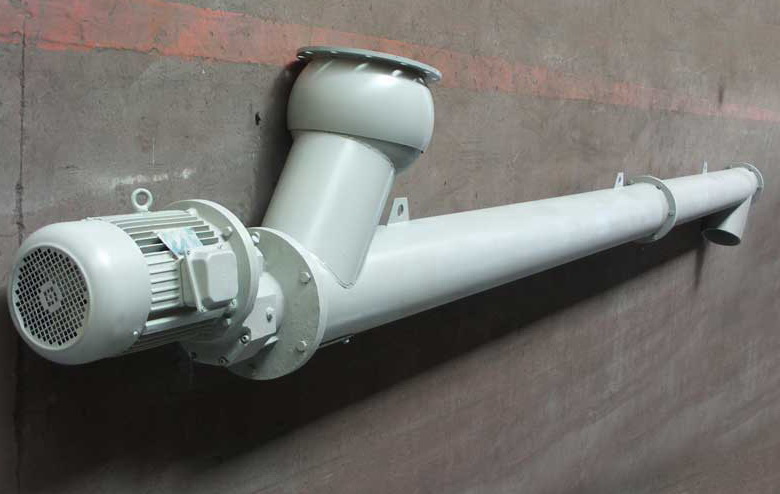 Винтовой транспортер представляет собой полую трубу (диаметр подбирается в зависимости от требуемой производительности), в которой вращается подающий винт. Витки винта изготовлены из листовой стали и приварены к валу. При вращении вала транспортируемый материал захватывается в загрузочном патрубке и равномерно перемещается его по всей длине конвейера. Для контроля процесса предусмотрены смотровые люки. Шнек (винт) приводится во вращение редуктором, мощность которого подбирается в зависимости от производительности. В зависимости от назначения привод шнека может быть смонтирован по тянущей или толкающей схеме.